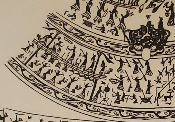 成都百花潭铜壶纹饰线图之局部,右下可见四名执长矛的舞者;西周时期宴乐舞蹈发展到战国时期肯定有变化,但可借以略窥其貌(此例为笔者所举,非李先生所讲)