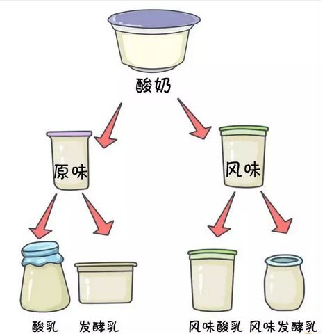 酸奶总共分为两大类:原味和风味。在这之下,原味又分为酸乳和发酵乳;风味又分为风味酸乳和风味发酵乳。