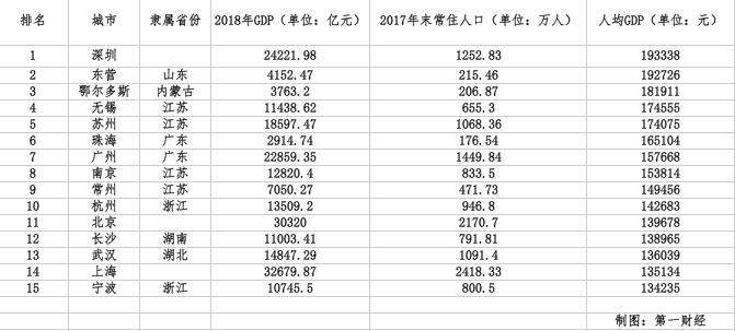 根据这一标准,第一财经记者通过梳理中国各城市公布的2018年经济数据,并以2017年末各城市常住人口为基准,发现有15个城市人均GDP超过2万美元。