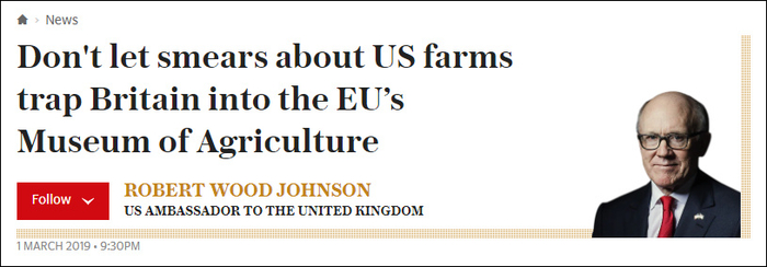 据英国《卫报》3月2日报道,在这篇名为《对美国农业的抹黑,正把英国带进欧盟“古董农业”的陷阱》的文章中,他表示美国食品是安全的,而那些有关“氯洗鸡”(chlorinated chicken)和“激素牛肉”(hormone beef)的传言只不过是“被用来误导公众的恐怖故事”。