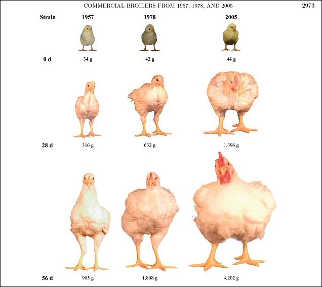 《每日邮报》放出的“弗兰肯斯坦鸡”与过去的肉鸡体型大小对比图