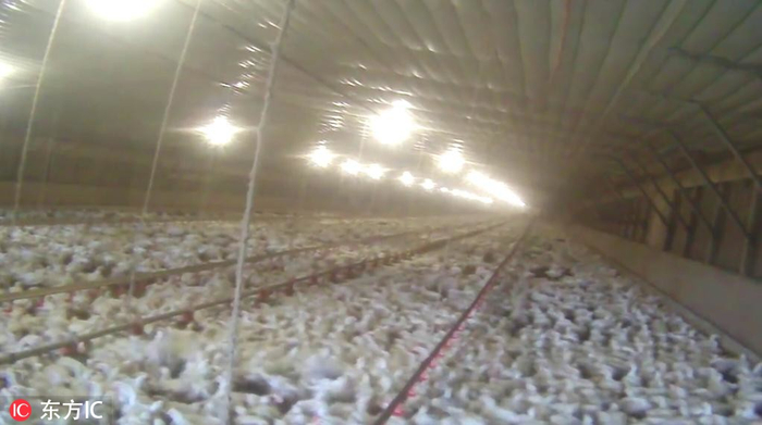 2015年爆出的美国麦当劳供应商虐鸡视频片段,可以看出这些鸡的生活环境十分拥挤。图@东方IC