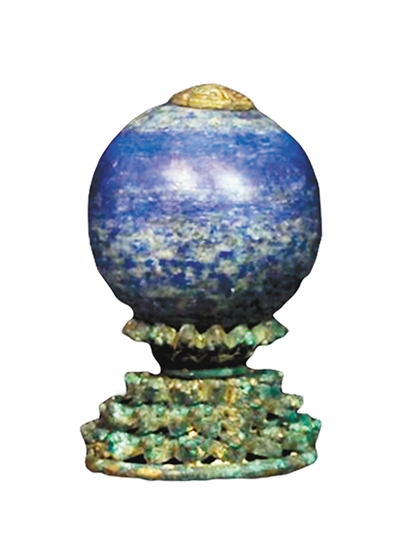 清代三品与四品官员间有一道分水岭,二者权力、待遇差距甚大,这点从其顶珠的材质可见一斑。青金石在中国古代亦为一般珠宝,有璆琳、金精、瑾瑜、青黛等别称。青金石经丝绸之路由阿富汗传入中国,其通常为集合体产出,呈致密块状、粒状结构,颜色为深蓝色、紫蓝色、天蓝色、蓝绿色等。此外,青金石还是古代天然蓝色颜料的来源之一。