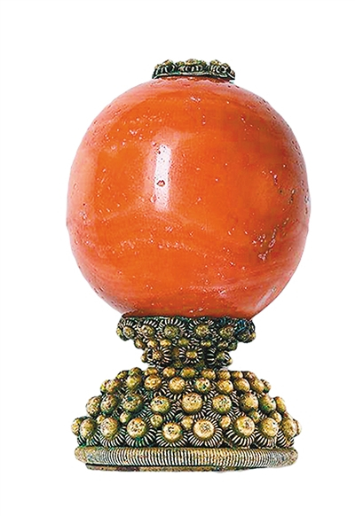 相比红宝石顶珠,红珊瑚顶珠的存世量较大,民间亦有收藏。2015年,一枚品相完好的红珊瑚顶珠在香港某拍卖行上拍,最终以3.8万元成交。该顶珠直径仅3厘米,就其体量而言,价格已然不菲。