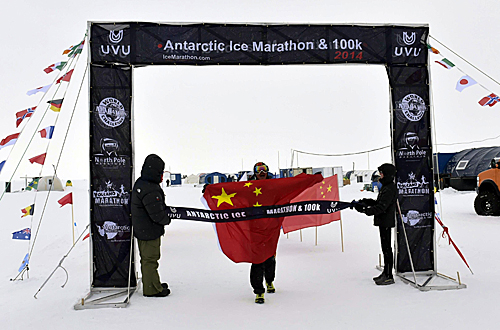 2014年,中国极限马拉松运动员陈盆滨在南极100公里极限马拉松赛中率先冲过终点。新华社发