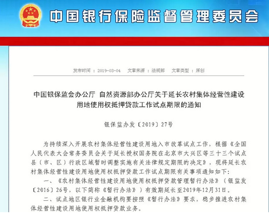 通知明确,此前出台的《农村集体经营性建设用地使用权抵押贷款管理暂行办法》有效期延长至2019年12月31日。试点地区银行业金融机构要按照暂行办法要求,稳步推进农村集体经营性建设用地使用权抵押贷款业务。