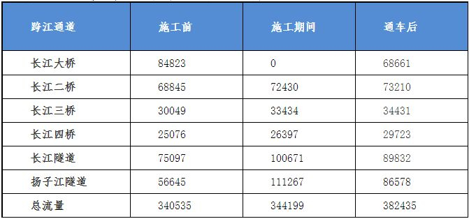 长江大桥于2016年10月正式封闭施工,在大桥封闭前,南京主要的过江通道分别是大桥、二桥、三桥、四桥、扬子江隧道和长江隧道。在大桥施工期间,各过江通道的总日均通行车流量为344199辆。12月29日大桥重新开通后,6条过江通道的总流量上升到了382435辆,相比之前上升了11.1%。