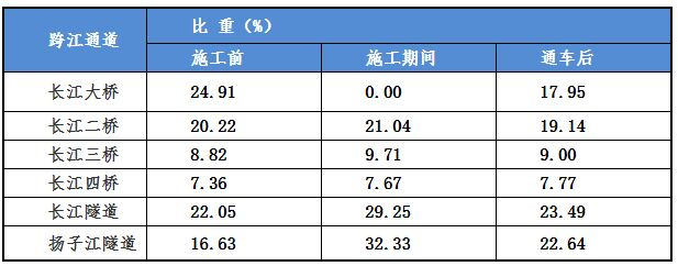 目前,南京共有6条主要跨江通道,其中长江二桥、三桥和四桥均为收费通行模式,除长江二桥外,三桥和四桥距离主城区相对较远,因此在跨江通道中流量所占比例变化较小。主要是扬子江隧道、长江隧道由于两端分别连接江北快速路、江南内环线等快速通道,且距大桥相对较近,在大桥施工期间承担了较大的分流作用。