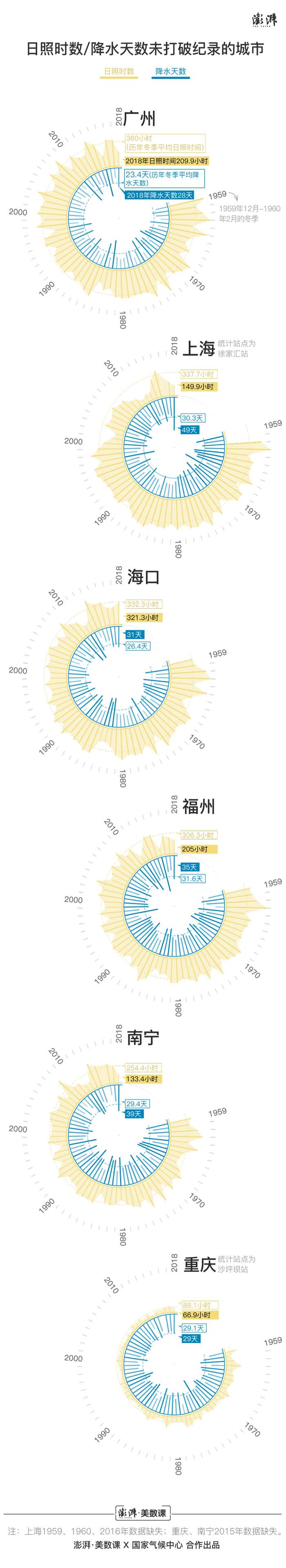 澎湃新闻将国家气候中心提供的最新天气数据整理后发现,今年冬天,南方多地打破近六十年来降水天数纪录。与历史同期数据相对比后,可以深切地感受到今年南方冬天的阳光真的是少得可怜。
