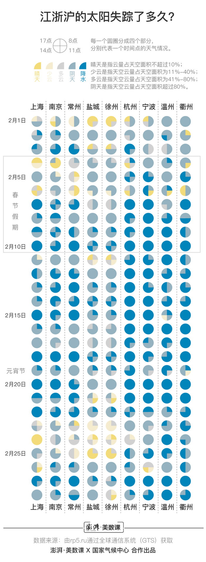 在刚过去的2月中,长江三角洲地区的诸多城市就没怎么出过太阳。春节假期,从正月初三起,这儿的人们就基本没看到过阳光,更别说晒衣服。其中,温州、衢州就是特别惨的城市,从2月7日开始,连续22天没有过晴天。
