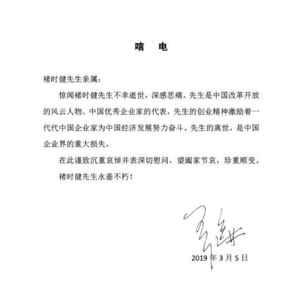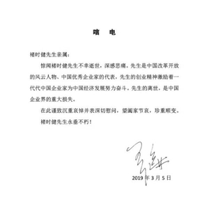 当天晚间,万达集团董事长王健林向褚时健亲属发唁电称,惊闻褚时健先生不幸逝世,深感悲痛。先生是中国改革开放的风云人物、中国优秀企业家的代表,先生的创业精神激励着一代代中国企业家为中国经济发展努力奋斗。先生的离世,是中国企业界的重大损失。