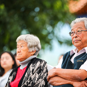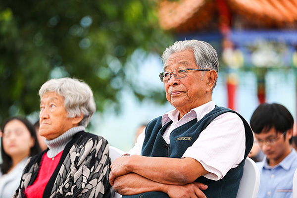 2015年10月10日,云南省玉溪市新平县,哀牢山褚橙庄园,褚时健带着妻子和儿子出席发布会,吸引众多媒体记者关注。