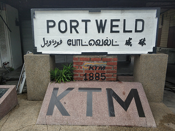 我到了太平之后,直接坐公交车前往瓜拉十八丁港口,寻找当年那条铁路的终点站。如今这条铁路已经没有了,火车在1960年代停运,1980年铁路线被拆除,站台也没有了。在瓜拉十八丁,只有一块当年的火车站标志牌保留了下来,上面记录了这里最早的名字“钵威”(PORT WELD),下面的红砖上写着“KTM 1885”(Keretapi Tanah Melayu,马来亚铁道的意思),是马来西亚最早的铁路唯一留存的部分。