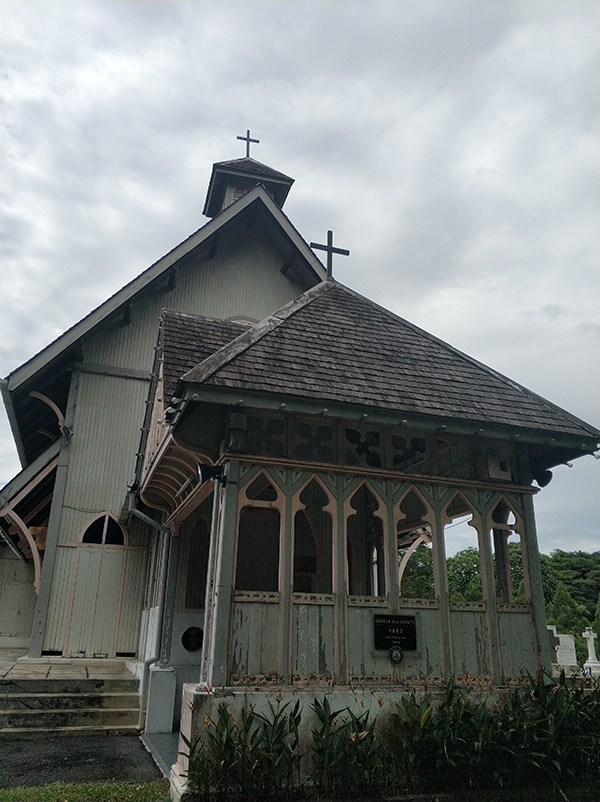 从市区走过去,会先经过一栋白色建筑,对着街道的是棱角分明的三层塔楼,这是1906年修建的英国军官办公室。这栋白色建筑对面就是诸圣堂。诸圣堂建于1883年,有很大一片庭院,教堂建筑白色墙壁灰色屋顶,木制外观,最引人瞩目的部分是1911年安装的彩色玻璃,这些玻璃在二战中难得被保存了下来。教堂旁边是一片小型墓地,墓地中埋葬的是早期英国殖民者,多数人死于热带疾病,还有一些因没有退休金无法回国,老死在这里。