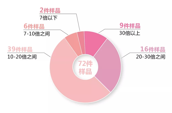 吸水倍率反映的是卫生巾的吸收量,吸水倍率越高,表明相同质量下的卫生巾可吸收经量越大。检测结果显示,吸水倍率最高可达43.6倍,最低为5.8倍。
