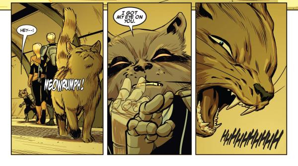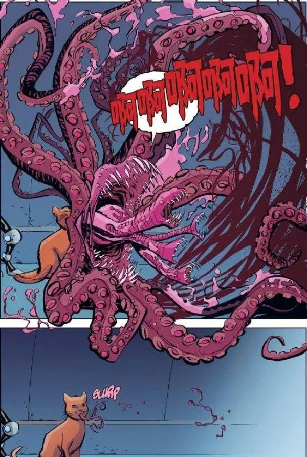 不过,Chewie在漫画里可不是只会卖萌撒娇,实际上人家可是个外星人(应该说是外星生物恰当点),浣熊火箭知道它的身世,在漫画里提到过这只猫是“Flerkens”(噬元兽)。