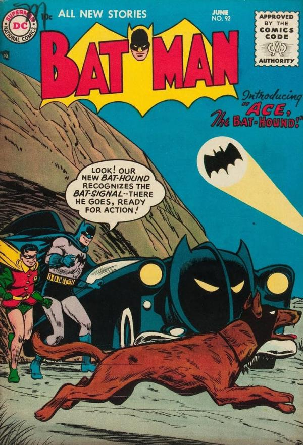 中文网络世界里有句流行语——万物皆可盘。放在蝙蝠侠的世界里,那么就可以说是“万物皆可BAT”,在1950年代的蝙蝠侠漫画里,有一个重要的动物角色,那便是蝙蝠猎犬(the Bat Hound),它大名叫“ACE”,是蝙蝠侠一次行动中救下来的德国牧羊犬,很快,它便也戴上眼罩,跟着蝙蝠侠上街打击犯罪(当然不要去研究一条狗戴个眼罩有什么意义)。