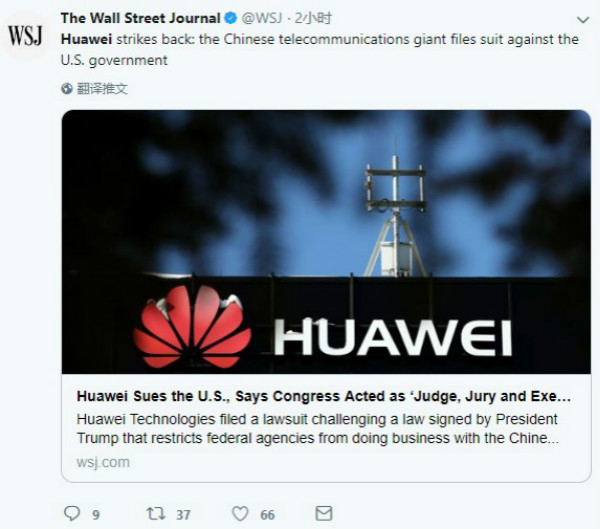 图说:《华尔街日报》在推特推送“华为反击”的报道 GJ图