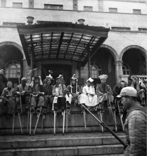 1949年,高跷队在铁路宾馆门前小憩,沈阳,46.2cm45.4cm。来源:中国美术馆供图