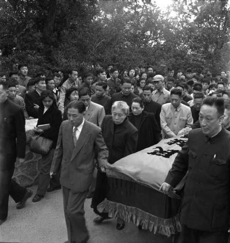 1956年,鲁迅墓迁墓,宋庆龄(左三)、茅盾、周扬、柯庆施、金仲华、许广平(左二)、锺民、李琦涛、巴金、靳以、唐弢等护送灵柩,上海,46.2cmx45.5cm。 来源:中国美术馆