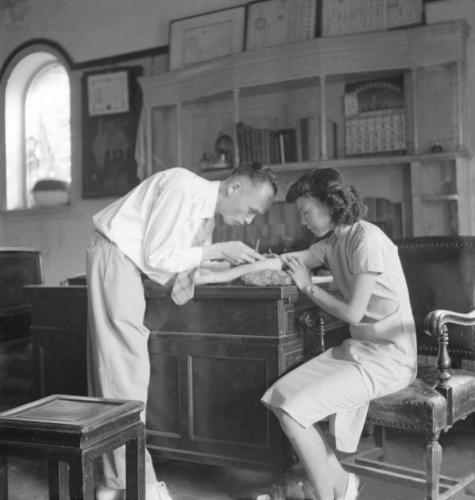 1949年,私人诊所医生在为病人打针,上海,46.3cmx45.5cm。 来源:中国美术馆供图