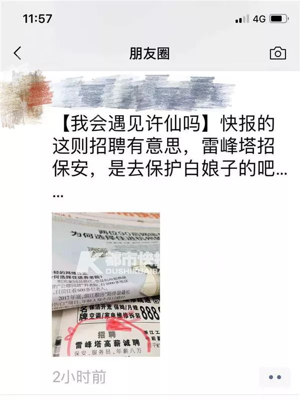 前几天,某报纸上登了一则很小的招聘信息:雷峰塔高薪诚聘保安,年薪8万。但没想到竟在朋友圈传开,还有人评论:是去保护白娘子的吧……