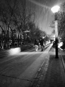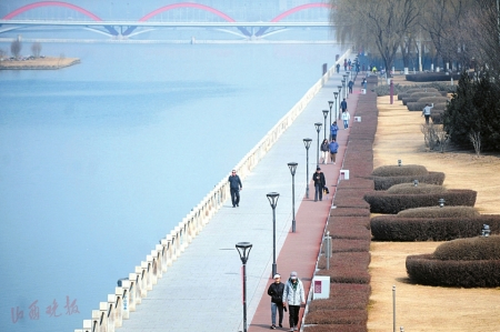 沿公园东南的环湖步道向北,首先能看到的,是公园南湖的一处广场。时下流行的鬼步舞,老人们热衷的健身操,你要喜欢,完全可以伴着或欢快、或舒缓的音乐快走、漫步。公园边,反射着光亮的冰湖,映衬着一对对男女老少,有携手同行,已步入古稀的白发夫妇;有相拥而行,不时说着情话的青年眷侣。