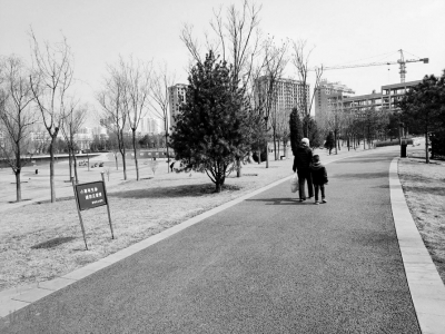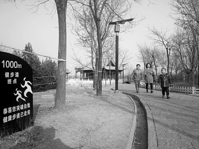 雕塑旁边的小路便是健身步道的起点,旁边路牌写着“走健康步道,步健康人生”。一个穿着蓝色外套的男孩,正在快步走,后面跟着妈妈和姥姥。“姥姥,咱们从这里出发,一直走到终点,不能跑只能走,看谁先走完。”后面,姥姥和妈妈的步伐也加快了。