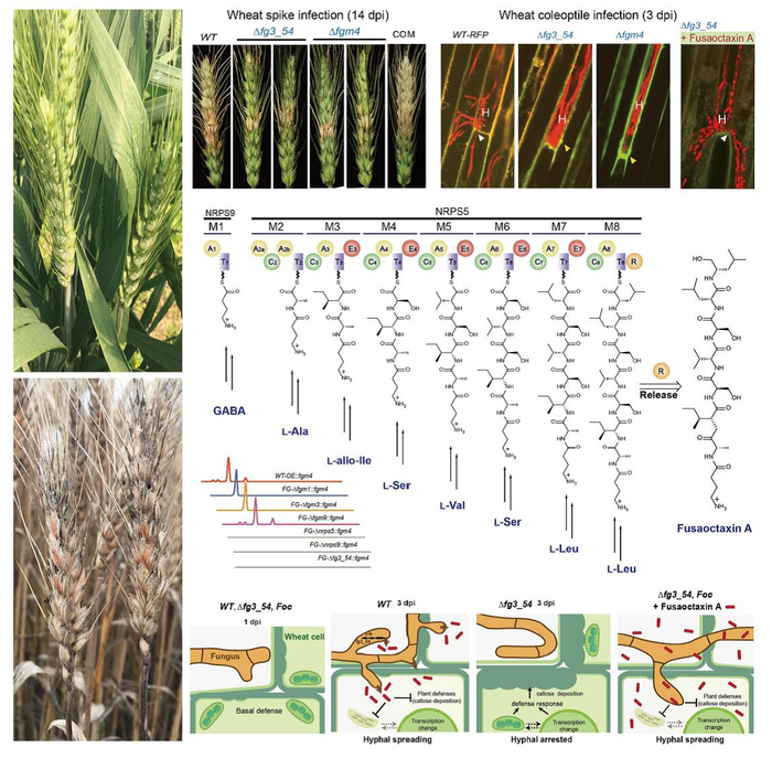 该研究团队在前期建立小麦胚芽鞘侵染系统,显微追踪揭示禾谷镰孢菌在胚芽鞘中的菌丝扩展分为三个时期:接种后16小时为代表的小麦细胞间延伸(intercellular growth),接种后40小时为代表的小麦细胞内分支生长(intracellular growth)以及接种后64小时为代表的从一个小麦细胞穿壁入侵相邻细胞依次扩展(cell-to-cell invasion),进一步运用激光显微切割技术获得了禾谷镰孢菌侵染小麦胚芽鞘的过程中接种后16小时、40小时及64小时这三个时期的高清表达谱(Zhang, et al. 2012 Plant Cell 24: 5159–5176)。时期特异性的真菌表达谱分析揭示禾谷镰孢菌3号染色体上以往认为不表达的相邻八个基因在侵染64小时的菌丝穿壁侵染(cell-to-cell invasion)时期特异性表达。这八个基因串联排列,其中包含两个非核糖体多肽合成酶基因,组成一个未知产物的潜在次生代谢合成基因簇fg3_54。fg3_54以及其中单个基因的敲除突变体菌丝体外生长正常,但在侵染小麦胚芽鞘和麦穗时丧失了穿透寄主细胞间屏障的能力,被相邻细胞的细胞壁加厚所阻碍,致病力大幅下降。之后研究发现基因簇内fgm4编码b-ANK类转录因子新成员,在体外过表达后可以激活fg3_54各成员基因的转录,克服了野生型禾谷镰孢菌不能在体外产生fg3_54产物的困难。fgm4过表达菌株发酵产物分析鉴定出fg3_54编码的两个非核糖体肽合成酶NRPS5和NRPS9的装配产物是一个线性的、具有还原性C端且富含D型氨基酸的非核糖体八肽——镰孢菌素A。丧失了镰孢菌素A合成能力的fg3_54相关突变体侵染小麦的致病力均大幅下降,而外施化学合成的镰孢菌素A能够恢复突变体的致病力,恢复其在小麦组织内穿壁生长(cell-to-cell invasion)的能力。fg3_54基因簇同源序列存在于多个能够侵染小麦的镰孢菌中,例如燕麦镰孢菌Fusarium avenaceum、黄色镰孢菌Fusarium culmorum,而其他一些缺乏fg3_54同源基因簇的镰孢菌,例如香蕉枯萎病菌Fusarium. oxysporum f. sp. cubense TR4 和梨孢镰孢菌Fusarium poae,也不能够侵染小麦胚芽鞘。有意思的是外施镰孢菌素A还能使香蕉枯萎病菌和梨孢镰孢菌获得侵染小麦胚芽鞘的能力。此外,初步探索显示镰孢菌素A可能通过控制胞间连丝的开闭、抑制叶绿体光合相关活性等机制发挥作用。总之该研究发现并鉴定镰孢菌素A是直接参与禾谷镰孢菌与小麦相互作用的新分子。作为目前发现的唯一线性非核糖体肽类植物致病因子,镰孢菌素A能够帮助抑制寄主小麦的免疫防御反应,使镰孢菌菌丝在小麦中能够从一个细胞穿壁入侵旁邻细胞依次扩展(cell-to-cell invasion)。该研究进一步解析了禾谷镰孢菌侵染小麦的分子机理,补充了现有非核糖体多肽的种类及编码规则,为小麦赤霉病防治提供新靶标和新思路。