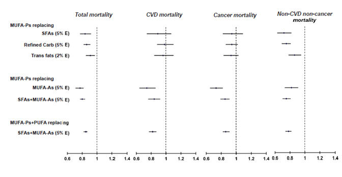 该研究纳入了2个大规模的前瞻性研究队列【护士健康研究(Nurses’ Health Study)、健康医护人员研究(Health Professionals Follow-up Study)】的近10万名调查对象,研究人员根据每四年一次的饮食问卷(FFQ)和产期更新的食品成分数据库评估调查对象的长期膳食状况。在22年的随访期内,共发现死亡案例20672例。通过统计分析,研究人员发现总MUFAs和MUFA-Ps与总死亡率呈负相关,而MUFA-As与总死亡率呈正相关。尤其值得引起注意的是,当植物来源的MUFA替换相同热量(按每日总能量摄入的5%计算)的饱和脂肪酸时,总死亡率下降16%;替换精加工的碳水化合物时,总死亡率下降14%;替换动物来源的MUFA时,总死亡率下降23%,心血管疾病死亡率下降26%,癌症死亡率下降27%,其它死亡率下降18%(下图)。