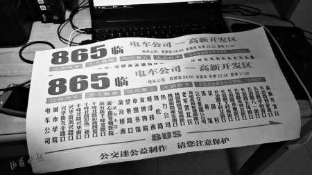 “刚贴了两天的站牌又被撕掉。这不,又要重新打印。”10日中午,太原公交迷“囧仔”把刚刚打印好的865路公交线路图贴和热力公司站名,贴到康乐街的公交站牌上。