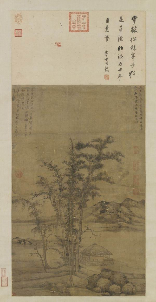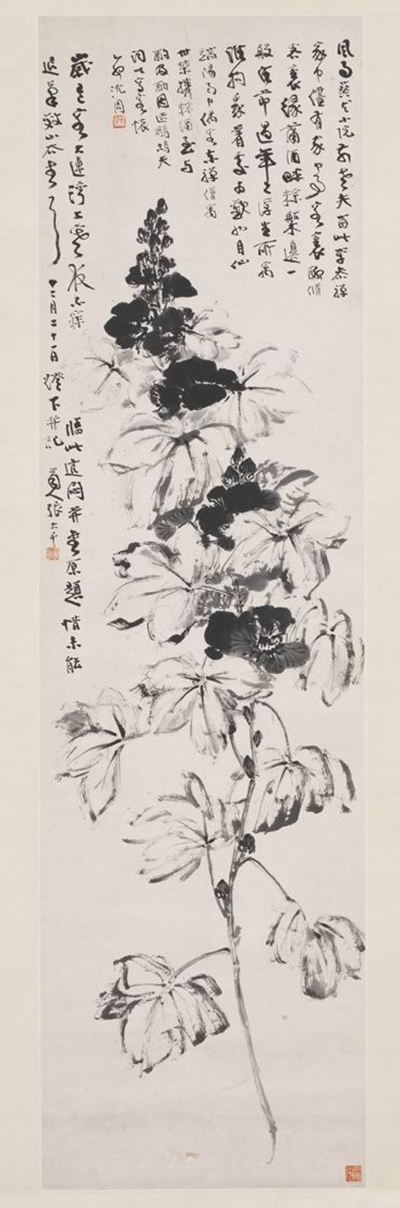 张大千的画艺受石涛(1642-1707)和八大山人(1626-1705)影响,并溯源至隋唐、北魏,长年沉浸于古代诸名家,尽收传统笔墨技法之精髓,从山水到人物、花鸟、畜兽等,各种画科无一不臻妙境。“大千摹古”部分将展出《张大千仿沈周蜀葵图》、《张大千仿石涛山水》、《张大千仿巨然夏山图》、《张大千画松林亭子》等。