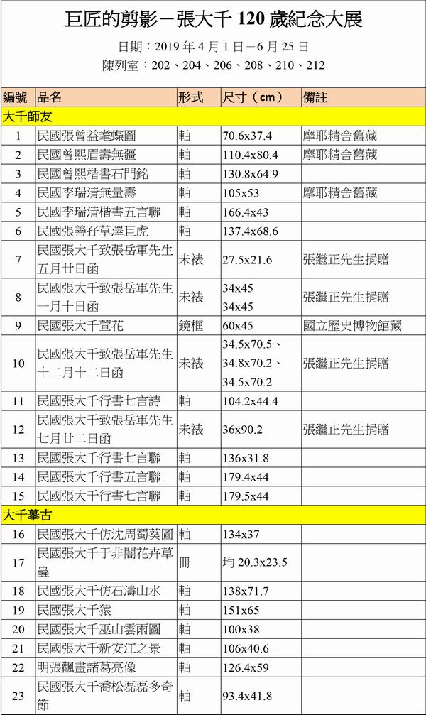 张大千不仅是一代书画大家,也是收藏大家,其藏品及大量张大千作品他身后,由家人整理好,全部列成目录,捐献台北故宫博物院,今年适逢张大千(1899-1983)诞辰120周年,“澎湃新闻·艺术评论”(www.thepaper.cn)获悉,台北故宫博物院将于4月1日〜6月25日举办“巨匠的剪影——张大千120周年大展”。从台北故宫博物院提供的展览清单中,展览将展出张大千及其旧藏书画精品87件,大千自用印80余方,全面反映张大千早、中、晚不同时期的艺术特色与精神。