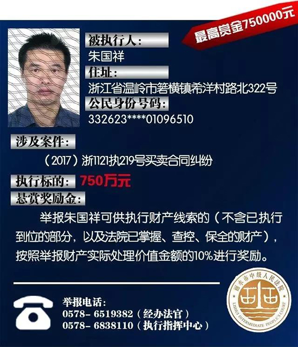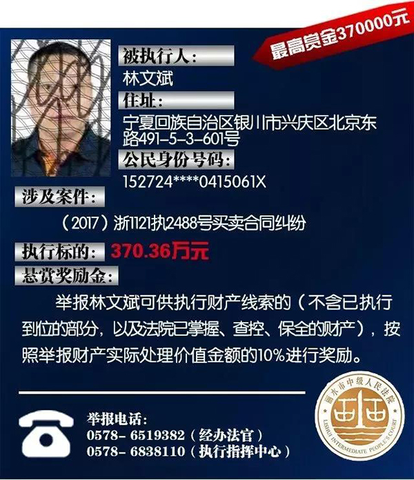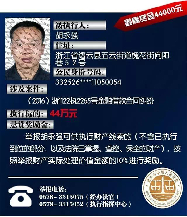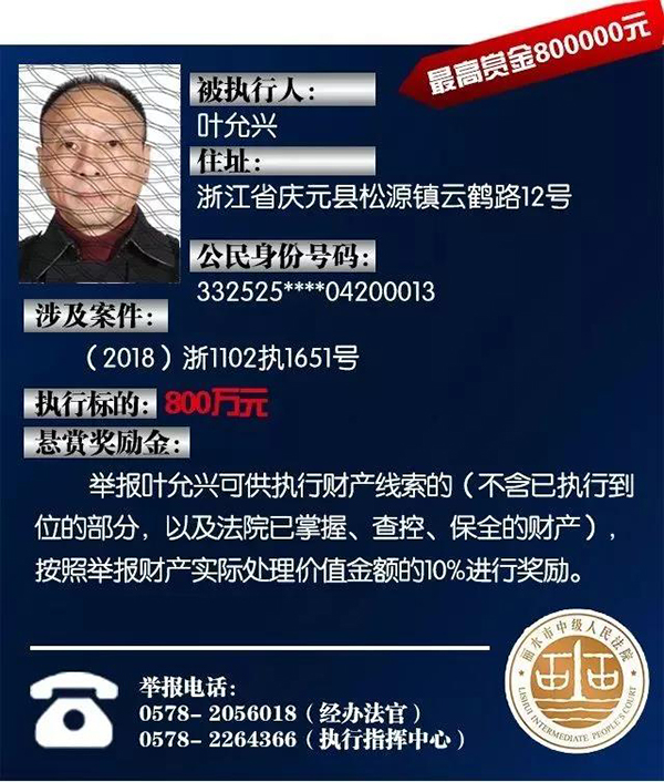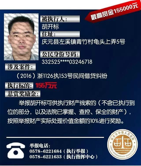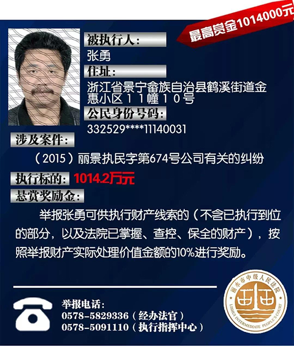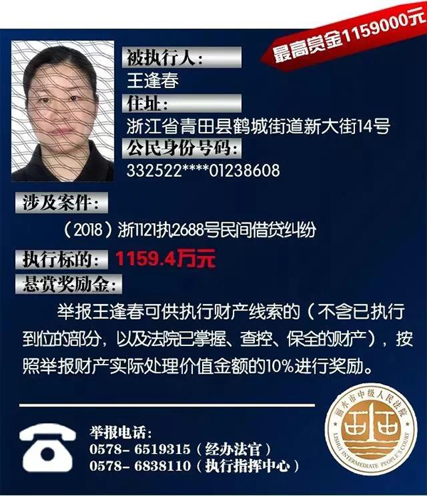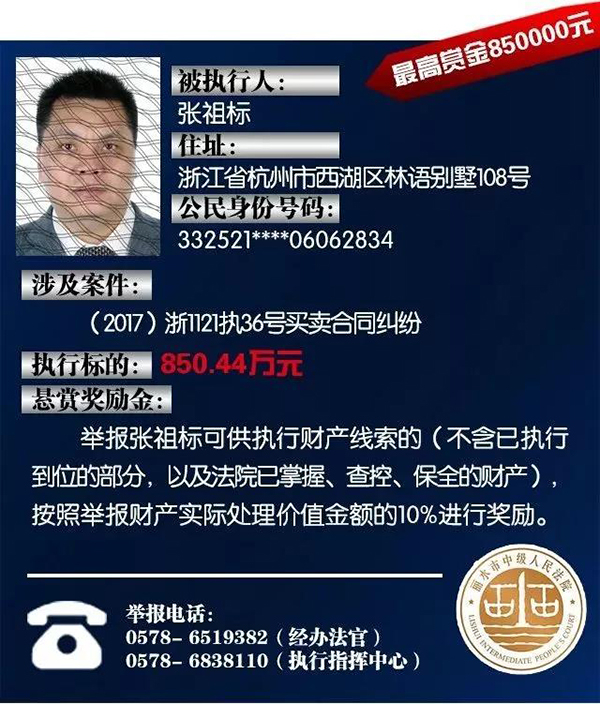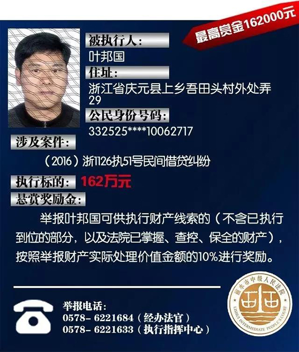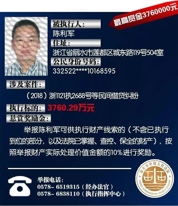 原标题:浙江丽水中院征集老赖财产线索:总标的1.6亿,悬赏10%
