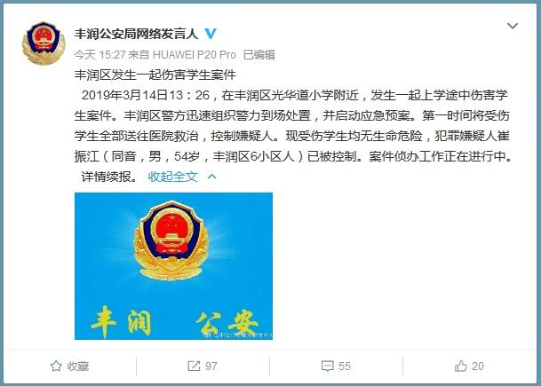 据河北唐山市丰润区人民政府新闻办官方微博@丰润发布3月14日消息,2019年3月14日13:26分许,在丰润区光华道小学附近,发生一起上学途中伤害学生案件。丰润区警方迅速组织警力到场处置,犯罪嫌疑人已被控制。截止目前,受伤学生全部送往医院救治,无生命危险。