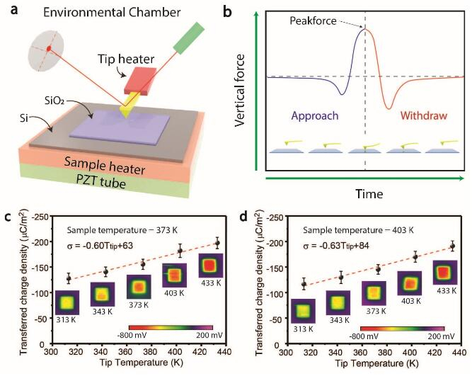 近日,在王中林指导下,中国科学院北京纳米能源与系统研究所林世权等人使用原子力显微镜(AFM)和开尔文探针力显微镜(KPFM)从微观尺度研究了不同温度下摩擦电荷的衰减行为以及温度差对摩擦起电的影响。他们在原子力显微镜的peakforce tapping模式下使用镀金探针在SiO2、Si3N4、AlN等样品表面进行接触产生电荷转移,随后在不同的温度下观察了样品表面摩擦电荷密度随时间的衰减规律,发现微观下的摩擦电荷衰减与之前研究中宏观尺度的衰减规律类似,都呈指数衰减,根据实验结果,他们提出了一个修正的摩擦电荷热电子发射模型。进一步,他们研究了当探针与样品存在温度差时两者之间的摩擦起电行为,发现在摩擦起电中温度升高会使固体更倾向于失去电子(带正电),温度降低会使固体更倾向于得到电子(带负电)。根据费米-狄拉克方程,当金属的温度升高时,金属中的电子跑到高能级的概率会增加,更倾向于离开金属表面,因此当金属与电介质接触的时候更容易失去电子,使电介质获得负电。相反的,当金属的温度降低时,金属中的电子跑到高能级的概率降低,金属与电介质接触时更倾向于获得电子,使与之接触的电介质获得正电。有一种特殊情况是,在温度相同时,电介质与金属接触获得正电。当金属温度升高到一定程度,而电介质温度保持不变,金属中的电子在温度的作用下更倾向于转移到电介质中,使电介质获得负电,发生摩擦电荷转移的极性反转。这一研究验证了王中林研究组之前提出的摩擦起电热电子发射模型的正确性,为摩擦起电电子转移理论提供了又一个强有力证据。