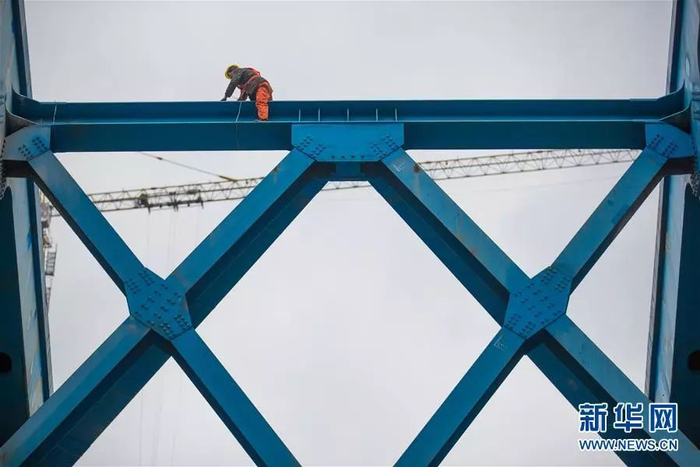 3月14日,施工人员在鸭池河特大桥上拆除辅助设施。新华社记者刘续摄