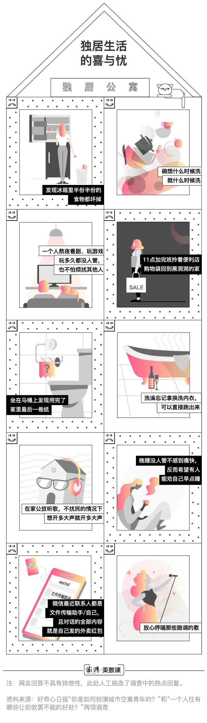 澎湃新闻整合了好奇心日报上“你是如何扮演城市空巢青年的?”和“一个人住有哪些让你欲罢不能的好处?”的两项调查。从上千位网友对独居生活日常的表态中发现,大部分网友的独居生活有苦也有乐。独居者虽然很享受自由生活,但在某些时刻也会感叹道“无人与我立黄昏,无人问我粥可温”。