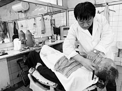 “可不是嘛,要不说刮胡子就是给男人做美容呢!”另一位老顾客应声附和,躺在可放倒的靠椅上,理发师会给你在脸上抹上肥皂水,用热毛巾捂上以后,理发师就在理发椅旁边的皮条上把剃刀磨光,你躺在老理发椅上,理发师给你刮胡子,非常舒服,绵绵的,感觉不到一点儿疼,这种气氛非常好。
