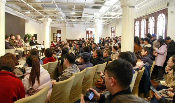 3月16日,马特·塞林格与作家路内、周嘉宁及译林出版社社长顾爱彬做客上海思南文学之家 摄影 杜湘涛