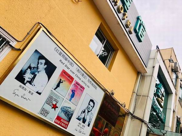 胡同另一头,有个中安宾馆,墙上有巨大标识:《红星照耀中国》(西行漫记)写作地旧址。是的,埃德加·斯诺和海伦·斯诺曾经住在这里,书中说他家是个有好几进的四合院,还有山东大汉保镖。他们生活豪华,常常举办派对。如今这一切都已不再,盖起了楼房。宾馆大堂里陈列着老照片,电视机里放着关于他们的纪录片。作为最先访问陕北并积极报道的西方记者,他们声名在外。电视里说,他们事业发展差异太大,终于在1949年离了婚(但是谁又知道到底是为什么呢?)。