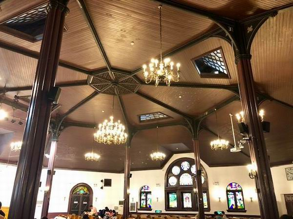 明城墙公园走到西边尽头,北侧马路对面有后沟胡同。走进去,会先经过亚斯立堂(Asbury Church),它是被义和团焚毁后1904年重建的。圆形的礼拜堂有深色木制天花板,阳光透过彩色玻璃射进来,温馨可爱。这座基督教堂也是全国重点文物保护单位。
