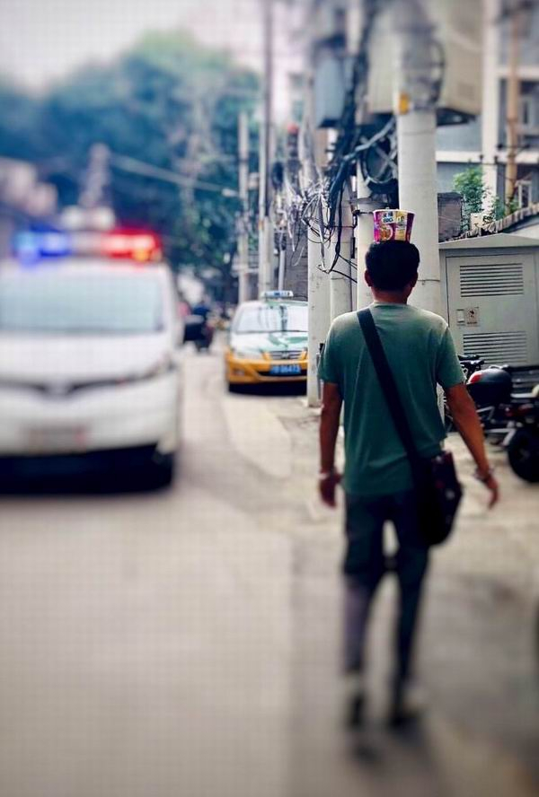 与船板胡同呈三十度角的还有一条苏州胡同(6),我倒是第一次去。书中说这里有各种各样的小吃店、还有算命杂耍、代写书信的,属于典型的红灯区旁配套商业设施。这也是帕梅拉最爱去的地方之一,并在此吃了生前最后一顿饭。正当我叹息现在这里没啥看头时,迎面走来一人,头上顶着一碗方便面。他走到我身后,我转身偷拍了他的背影。一旁警车里的警察笑着对我说:“发网上去?”