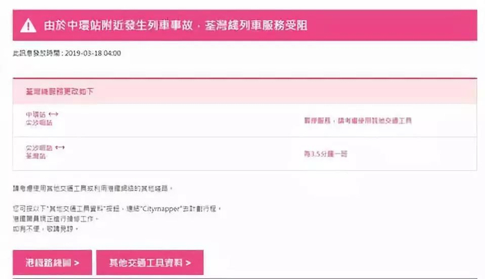 港铁表示尖沙咀至中环列车因事故致服务受阻。(截自港铁官网)