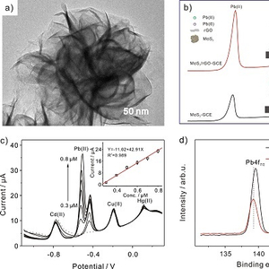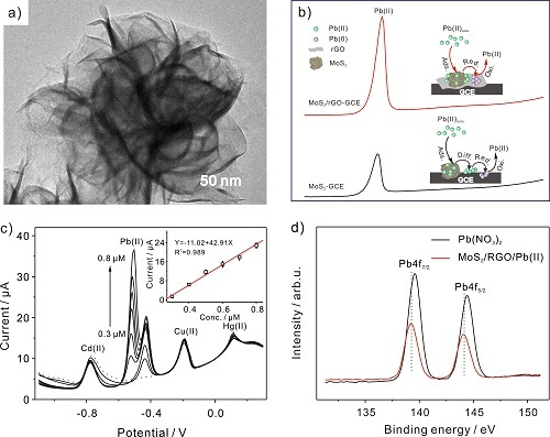 图:a) MoS2-RGO纳米复合物的TEM图;b) MoS2及MoS2-RGO纳米复合物修饰玻碳电极检测Pb(II)的示意图;c)在其他几种常见共存离子存在下,MoS2-RGO纳米复合物修饰玻碳电极检测Pb(II)阳极溶出伏安图;d) MoS2-RGO纳米复合物与Pb(II)相互作用的X-射线光电子能谱图。