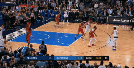 当第一节比赛还剩下8分35秒的时候,诺维茨基利用挡拆换到了鹈鹕后卫肯里奇·威廉姆斯面前,随后,他在罚球线的位置接到了东契奇的传球。