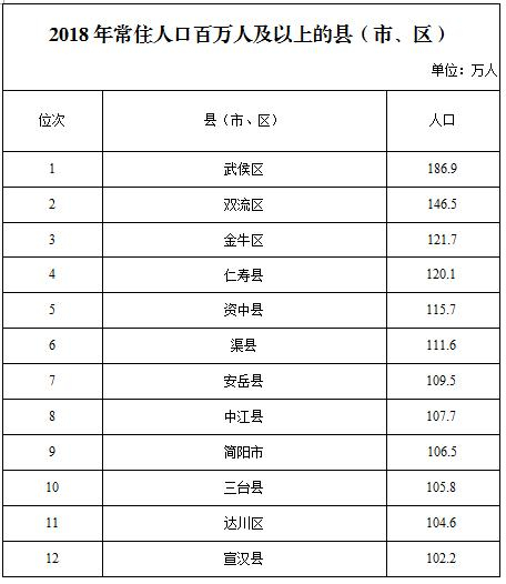 2018年,全省常住人口达百万人以上的县(市、区)有12个,(成都占1/3),分别是:武侯区、双流区、金牛区、仁寿县、资中县、渠县、安岳县、中江县、简阳市、三台县、达川区、宣汉县。