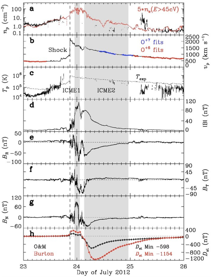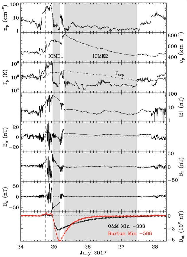 图2:1AU处的太阳风就地观测。左:2012年7月事件;右:2017年7月事件。