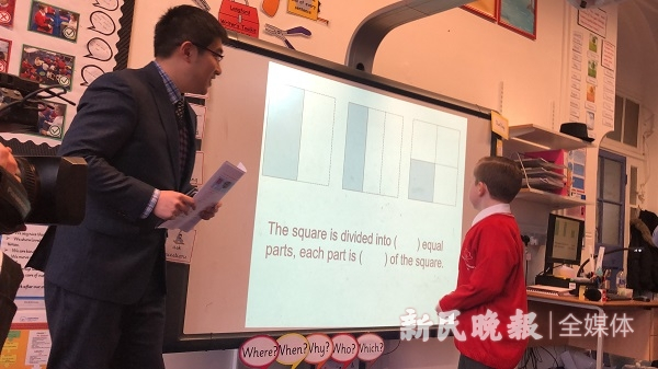 兰福德小学2年级教室里,来自浦东南路小学的徐颖捷老师正在上一节数学复习课。“豫园和上海,谁是部分,谁是整体?”“中国和上海,谁是部分,谁是整体”“1/3大还是1/2大?”短平快的问题一个接一个,孩子们大声说出答案。