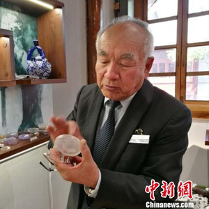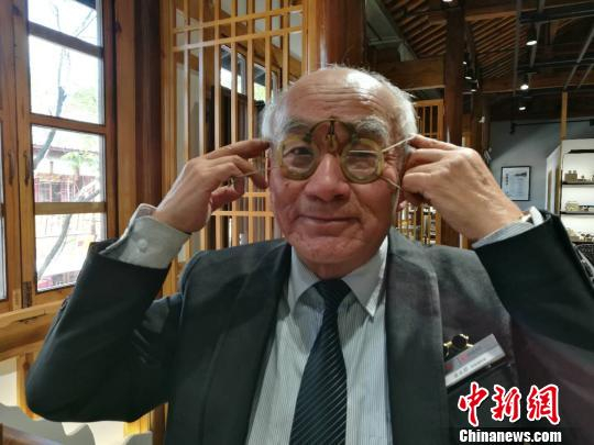 图为73岁的特级眼镜调校师章永祥展示古董眼镜戴法。 胡远航 摄